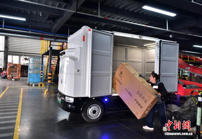 12月17日,位于河北省廊坊市开发区的一家快递转运中心,工作人员装运无人配送车。中新社记者 翟羽佳 摄