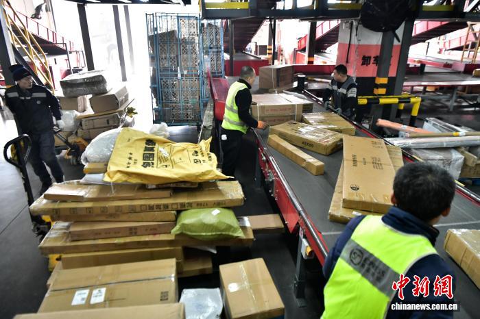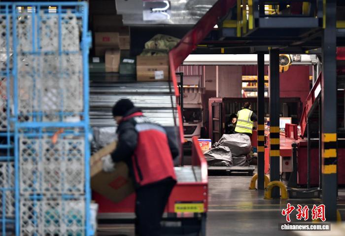 12月17日,位于河北省廊坊市开发区的一家快递转运中心,工作人员正在岗位上忙碌。中新社记者 翟羽佳 摄