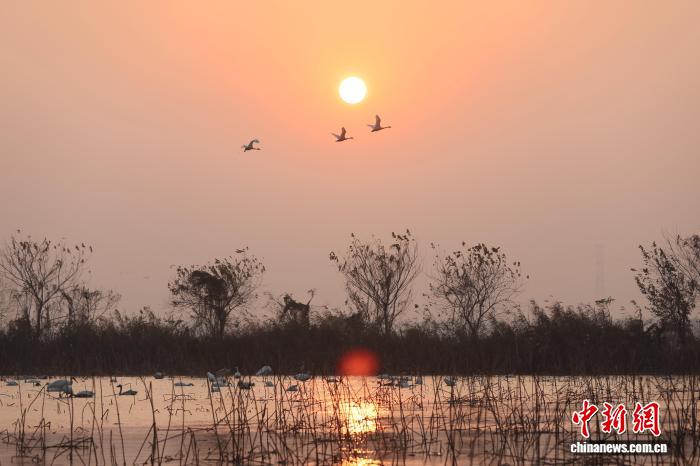 12月17日,在鄱阳湖畔的江西省南昌市五星白鹤保护小区,白鹤、小天鹅、白琵鹭等成群候鸟翔集于此。它们在一处藕田栖息觅食,静享冬日暖阳。图为夕阳下或飞翔或栖息的候鸟。中新社记者 刘占昆 摄