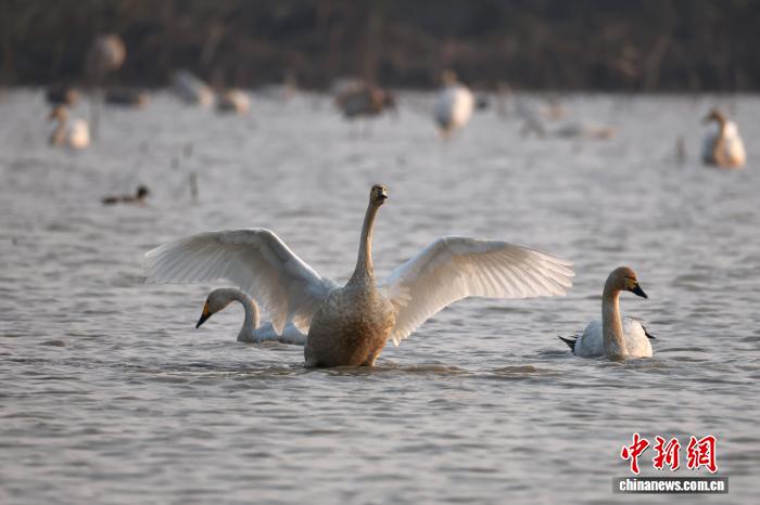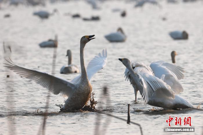 12月17日,在鄱阳湖畔的江西省南昌市五星白鹤保护小区,白鹤、小天鹅、白琵鹭等成群候鸟翔集于此。它们在一处藕田栖息觅食,静享冬日暖阳。图为水中拍打翅膀的天鹅。中新社记者 刘占昆 摄