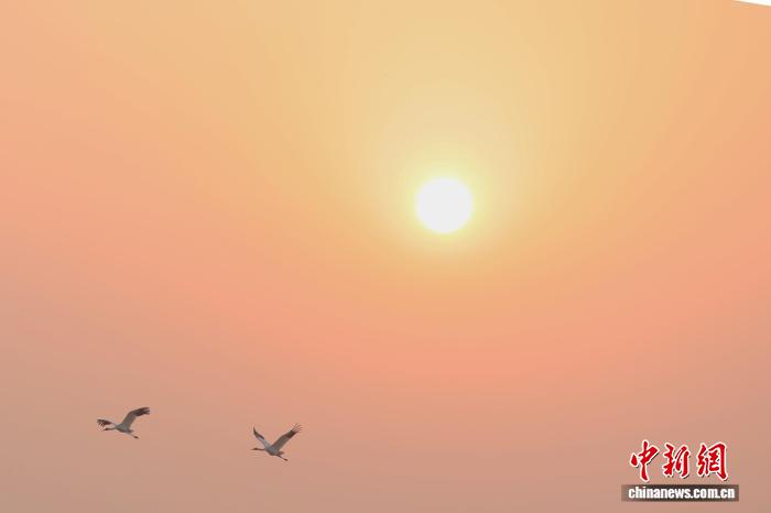 12月17日,在鄱阳湖畔的江西省南昌市五星白鹤保护小区,白鹤、小天鹅、白琵鹭等成群候鸟翔集于此。它们在一处藕田栖息觅食,静享冬日暖阳。图为夕阳下飞翔的白鹤。中新社记者 刘占昆 摄