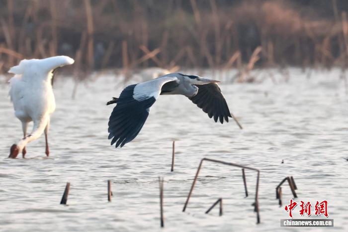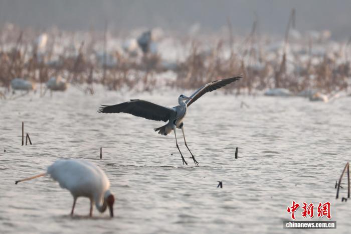 12月17日,在鄱阳湖畔的江西省南昌市五星白鹤保护小区,白鹤、小天鹅、白琵鹭等成群候鸟翔集于此。它们在一处藕田栖息觅食,静享冬日暖阳。图为翩翩起舞的苍鹭。中新社记者 刘占昆 摄