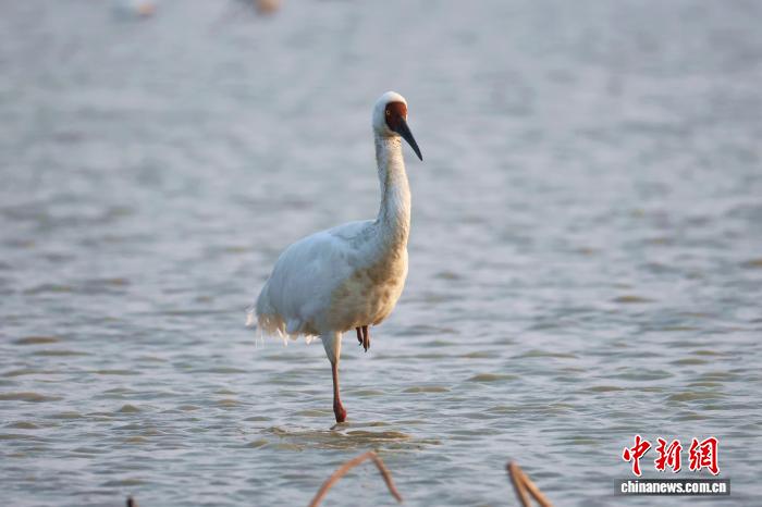 12月17日,在鄱阳湖畔的江西省南昌市五星白鹤保护小区,白鹤、小天鹅、白琵鹭等成群候鸟翔集于此。它们在一处藕田栖息觅食,静享冬日暖阳。图为水中单脚站立的一只白鹤。中新社记者 刘占昆 摄