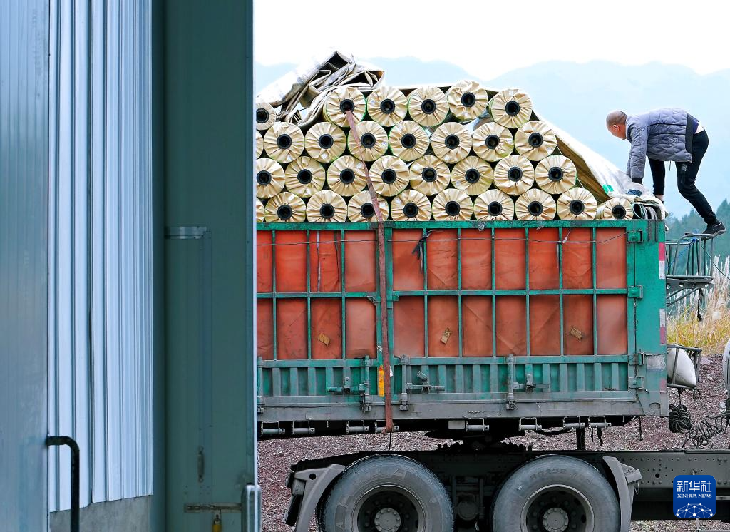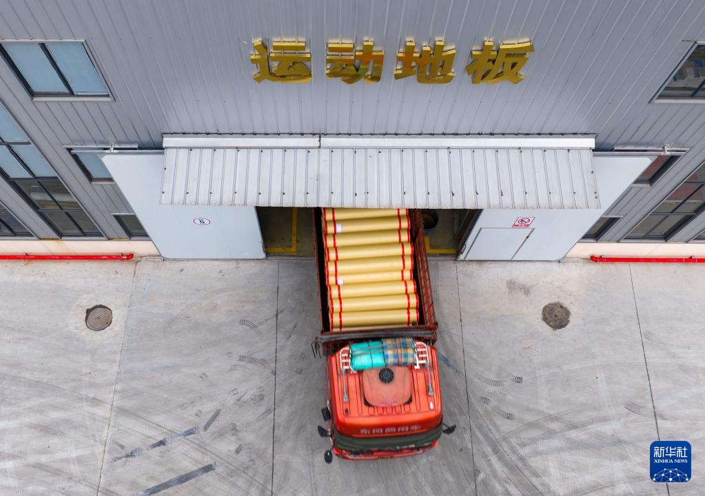 12月12日,在四川省广元市,一辆载有卷材地板的货车驶出制造车间(无人机照片)。