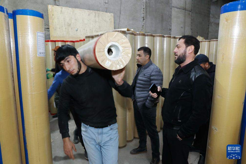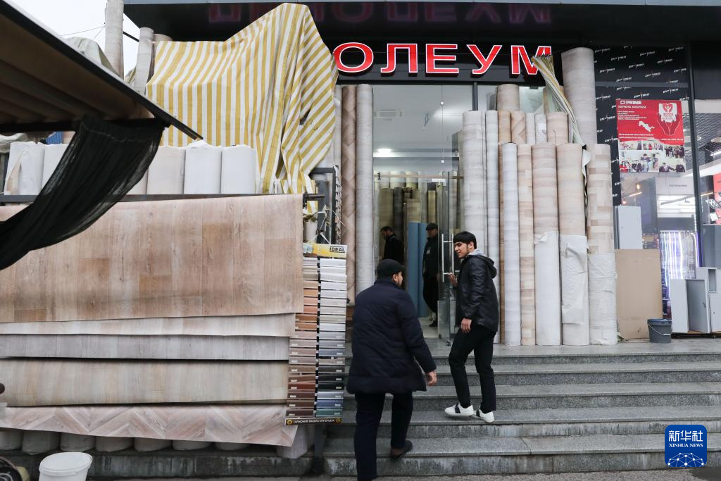 12月12日,在乌兹别克斯坦首都塔什干,当地商家塔什普拉托夫(右)请工人从仓库搬运卷材地板。