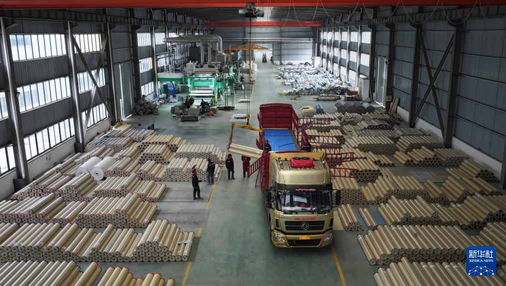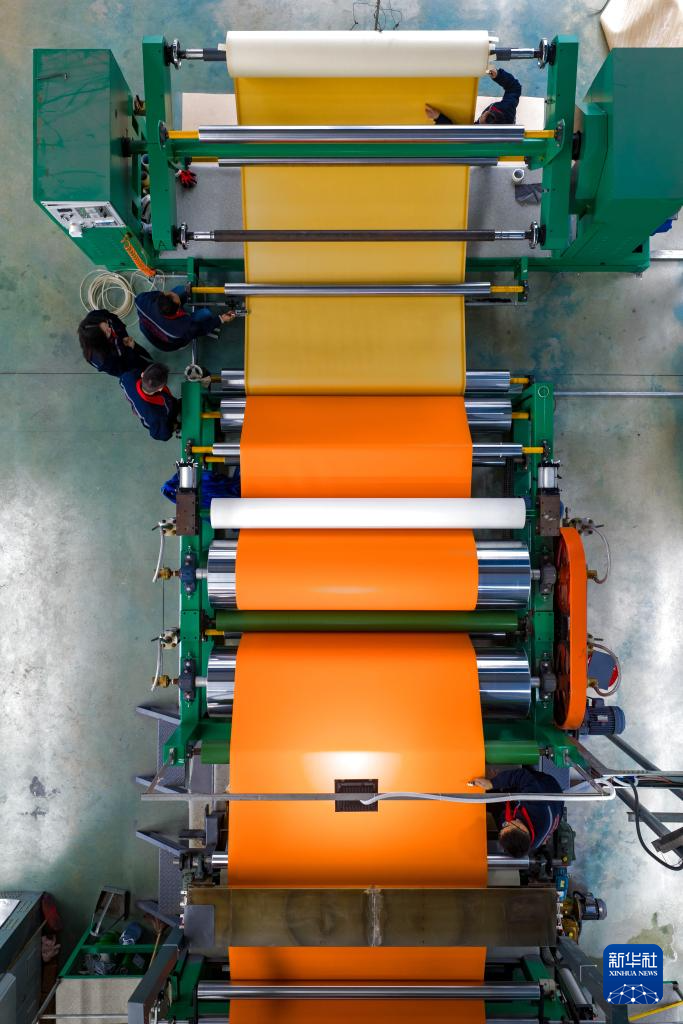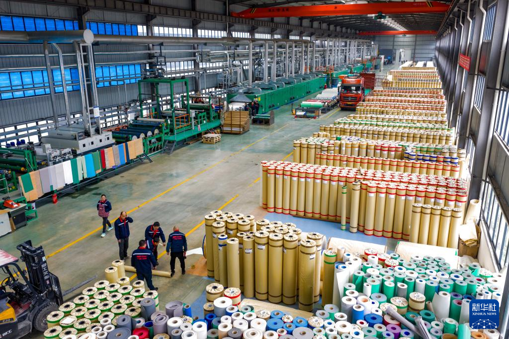 这是12月12日在四川省广元市拍摄的一家卷材地板制造车间(无人机照片)。