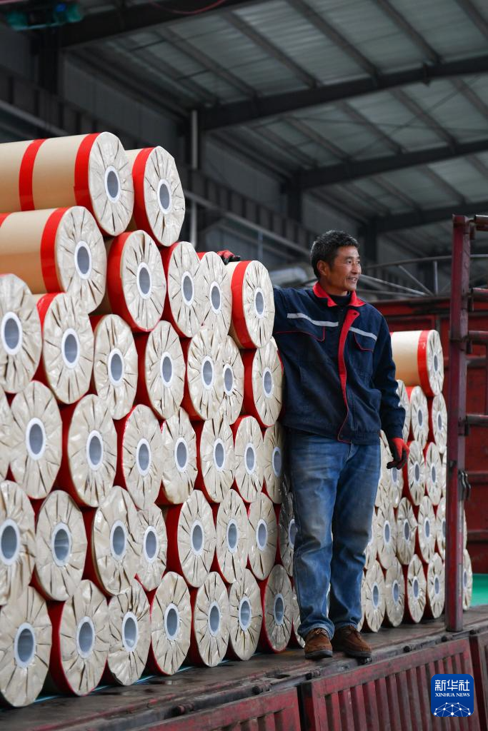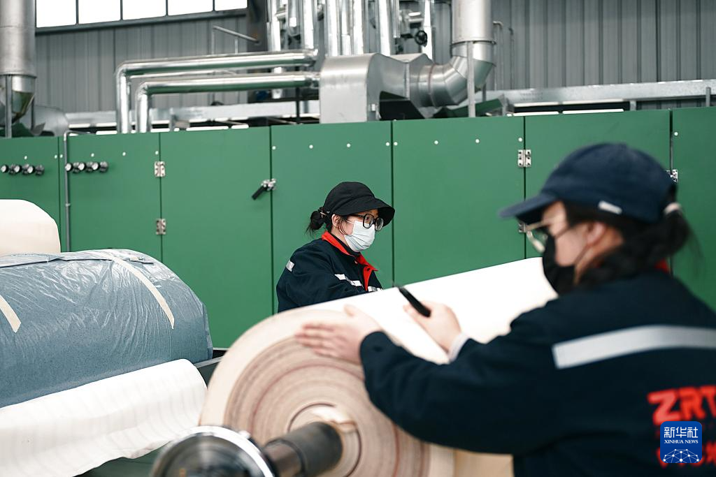 12月12日,工人在四川省广元市一家卷材地板制造车间整理离型纸。