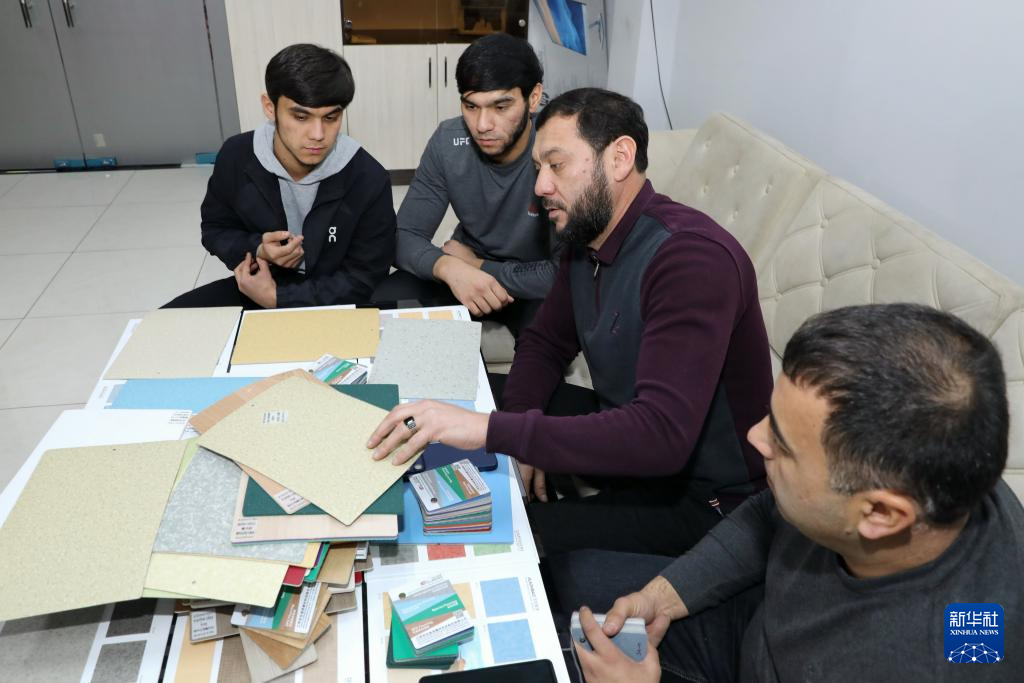 12月12日,在乌兹别克斯坦首都塔什干,当地商家塔什普拉托夫(右二)和同事翻看从中国进口的卷材地板样品。