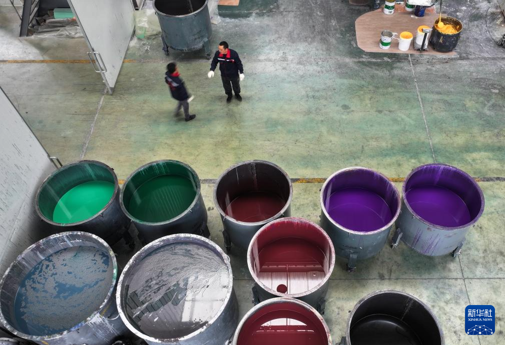 这是12月12日在四川省广元市拍摄的一家卷材地板制造车间的颜料区(无人机照片)。
