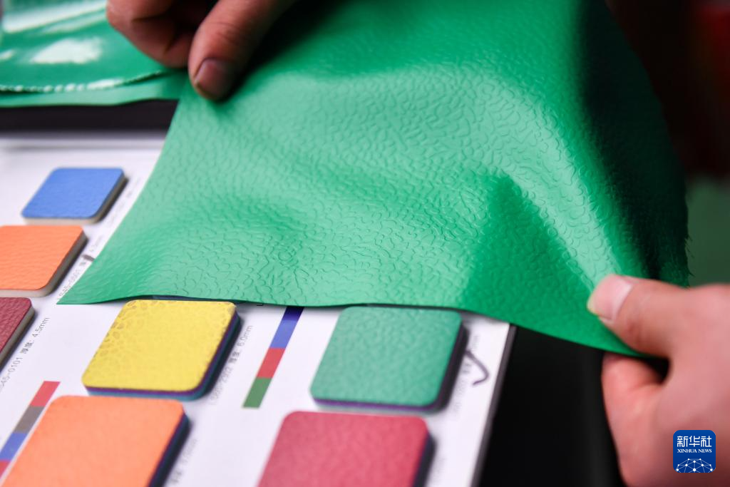 12月12日,工人在四川省广元市一家卷材地板制造车间比对样品颜色。
