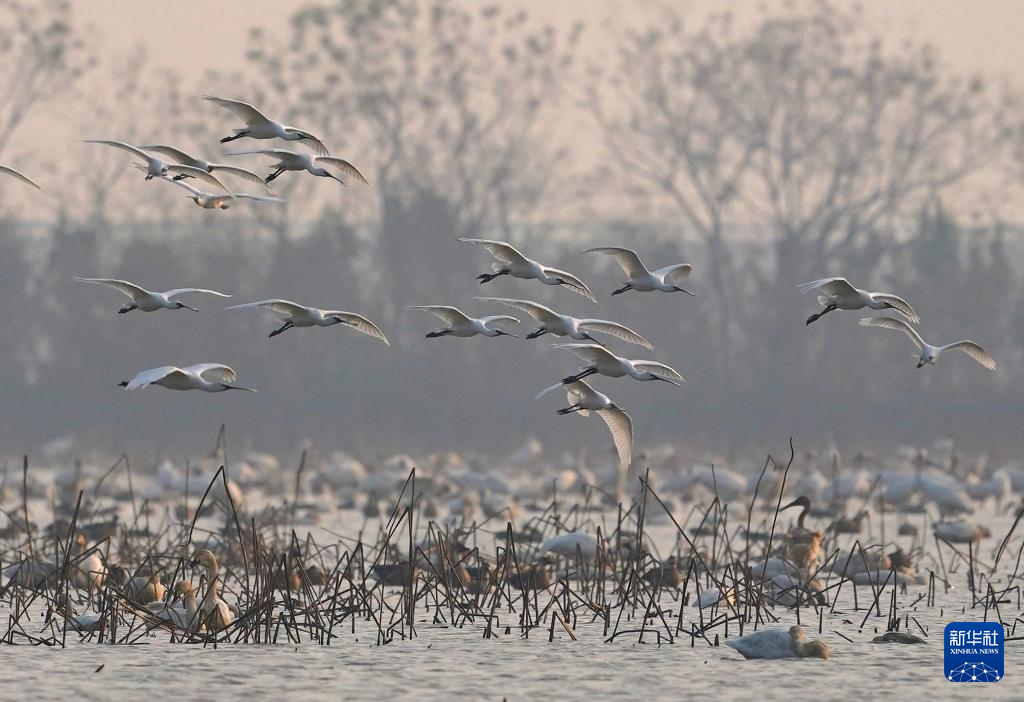 白琵鹭等候鸟在南昌五星白鹤保护小区内栖息飞翔(12月17日摄)。