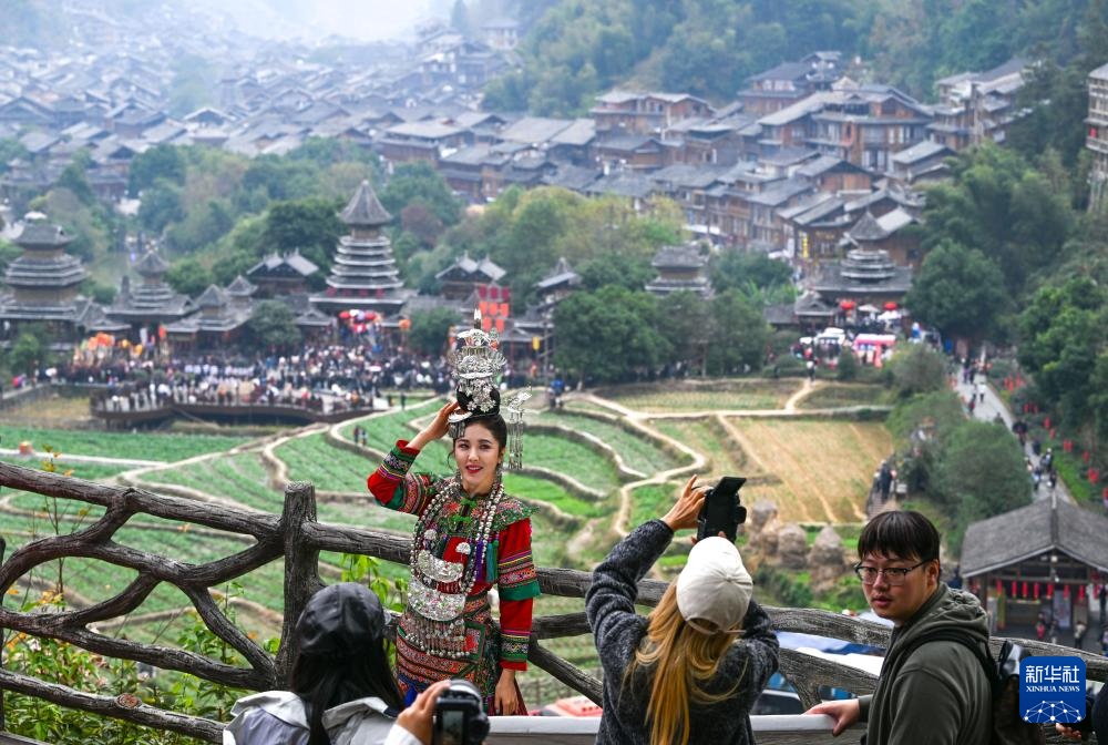 游客在贵州省黎平县肇兴侗寨观景台留影(12月20日摄)。