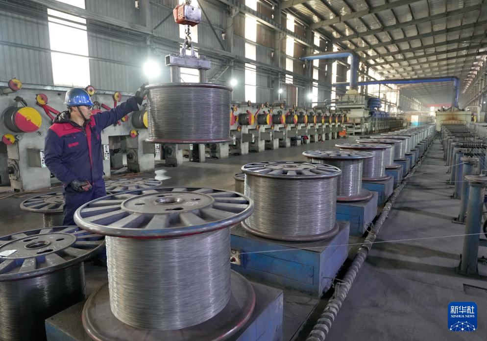 12月23日,工人在河北省迁安市鼎泰五金制造有限公司镀锌丝生产线上工作。