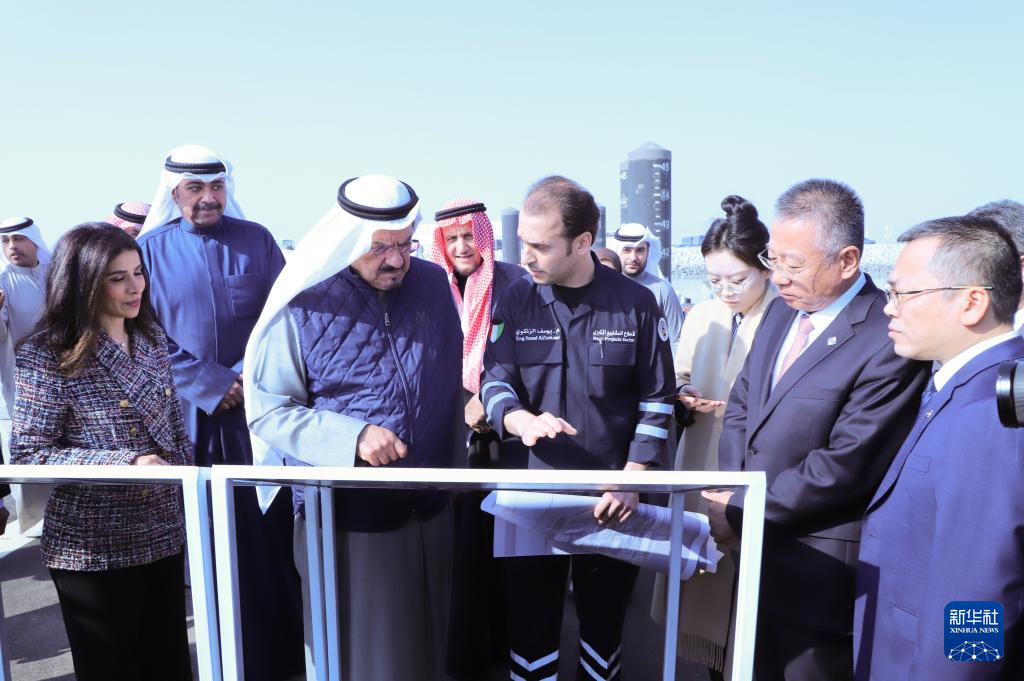 12月22日,在科威特杰赫拉省东北部布比延岛,科威特首相艾哈迈德(前排左二)在签约仪式后参观项目现场。