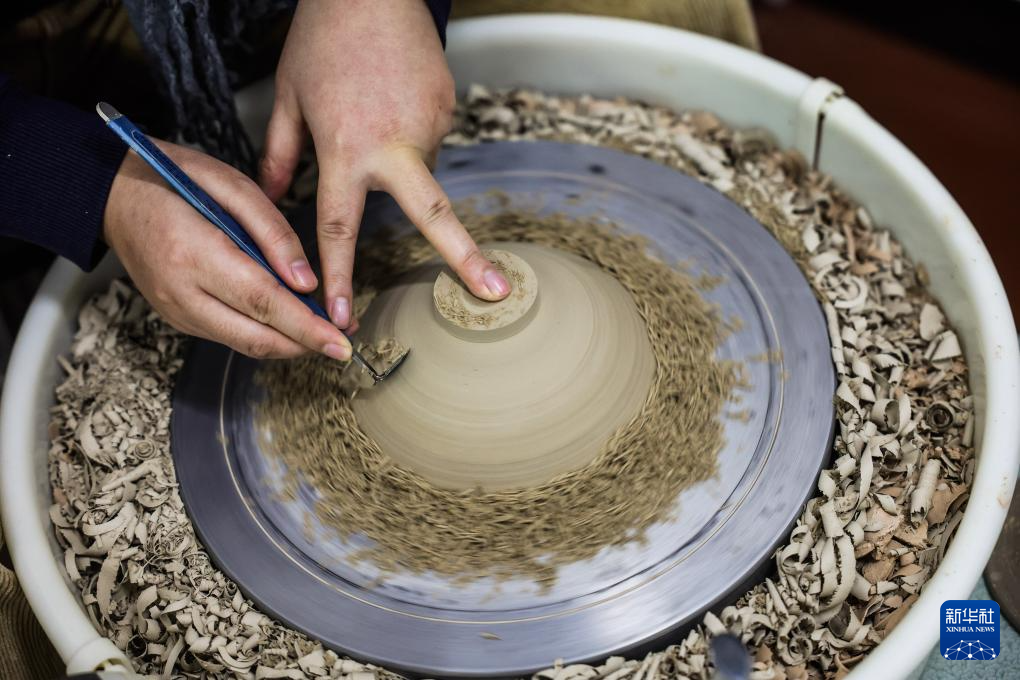 12月24日,侯梦露在位于匡堰镇倡隆村的楝树下艺术村落的东岙窑陶瓷艺术工作室内进行青瓷制作流程中的修坯。