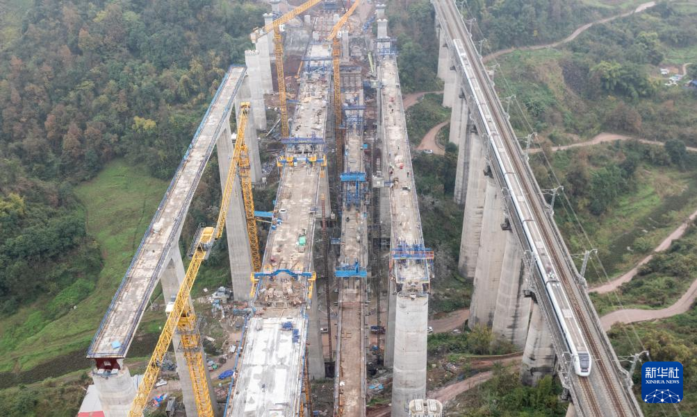 这是12月25日拍摄的渝万高铁打青沟左线大桥连续梁(右二)建设现场(无人机照片)。