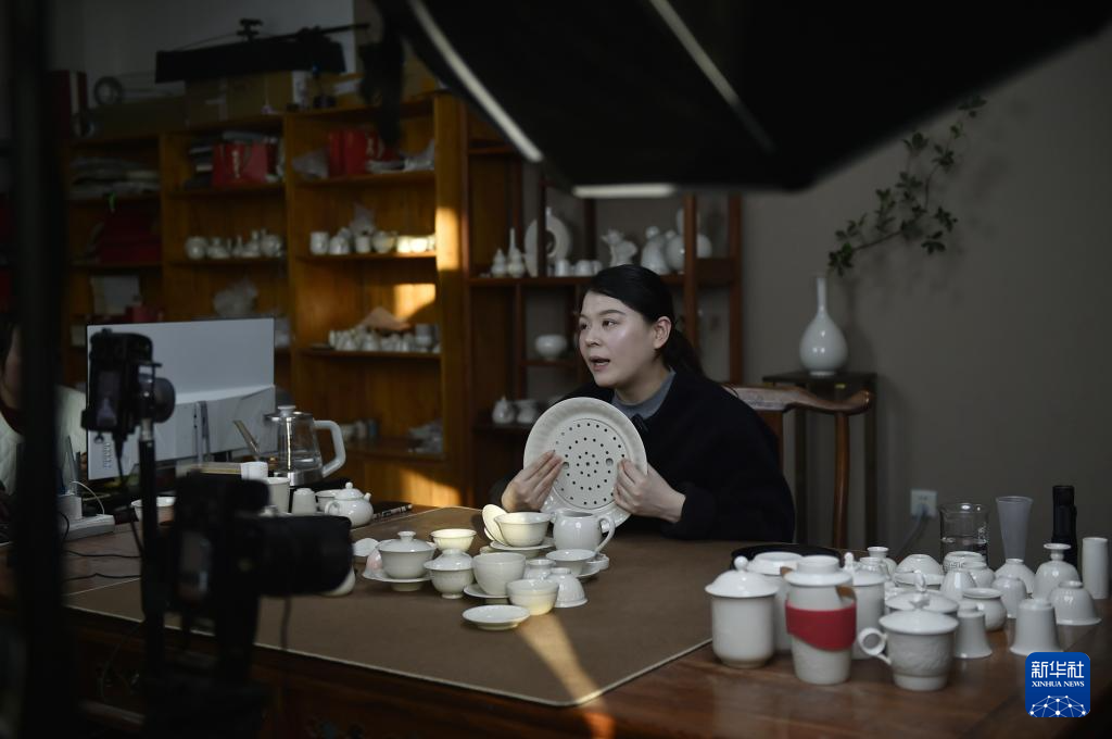 12月25日,工作人员在河北省曲阳县一家定瓷生产企业直播销售定瓷产品。