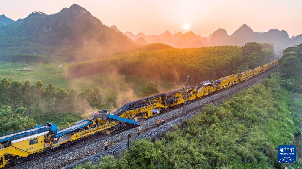 这是大机在西部陆海新通道的铁路轨道上进行清筛作业(2024年5月24日摄,无人机照片)。