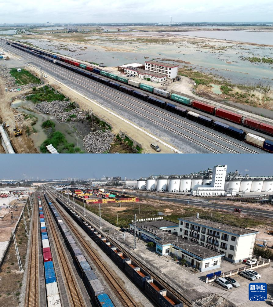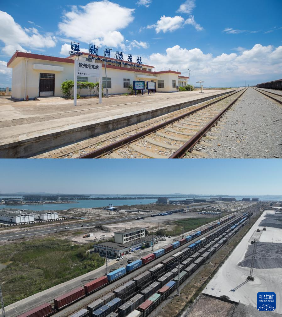 拼版照片:上图为2018年7月19日拍摄的钦州港东站,下图为如今的钦州港东站(2025年12月27日摄,无人机照片)。