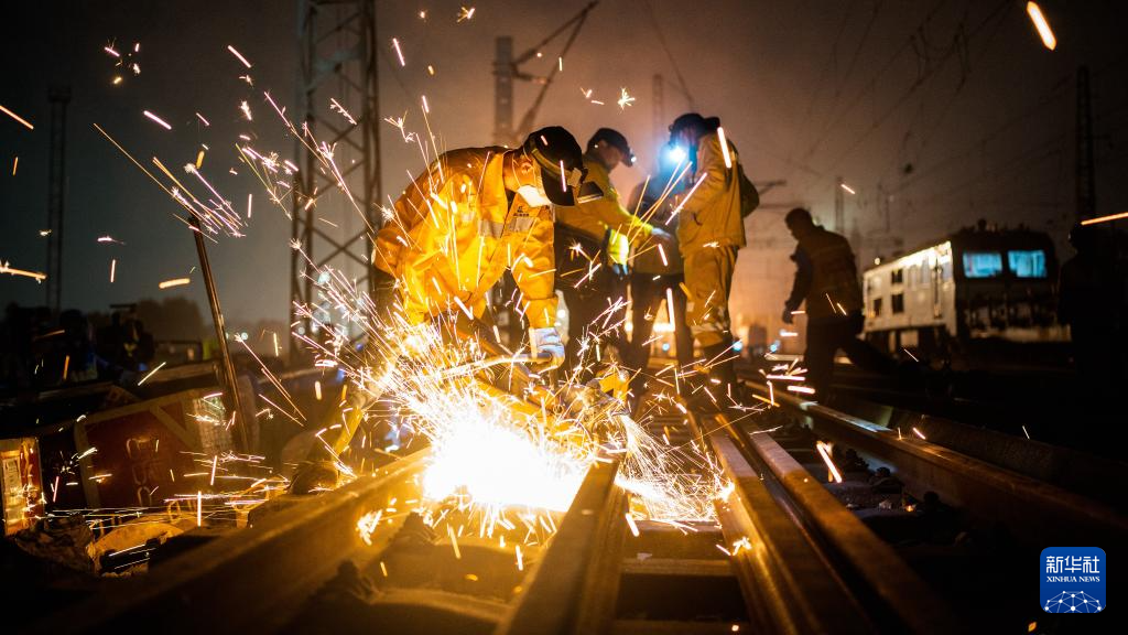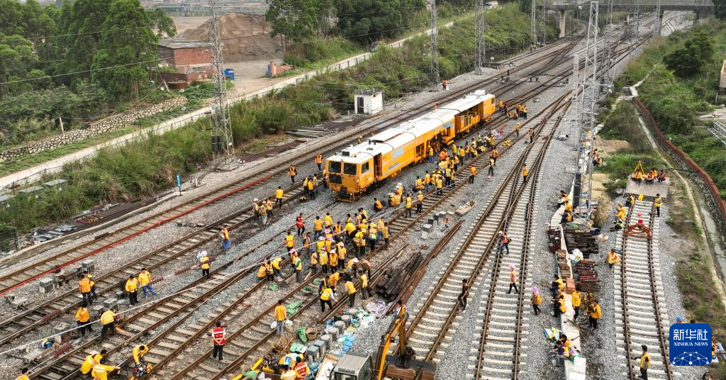这是铁路工人在西部陆海新通道的铁路轨道上更换钢轨(2023年4月12日摄)。