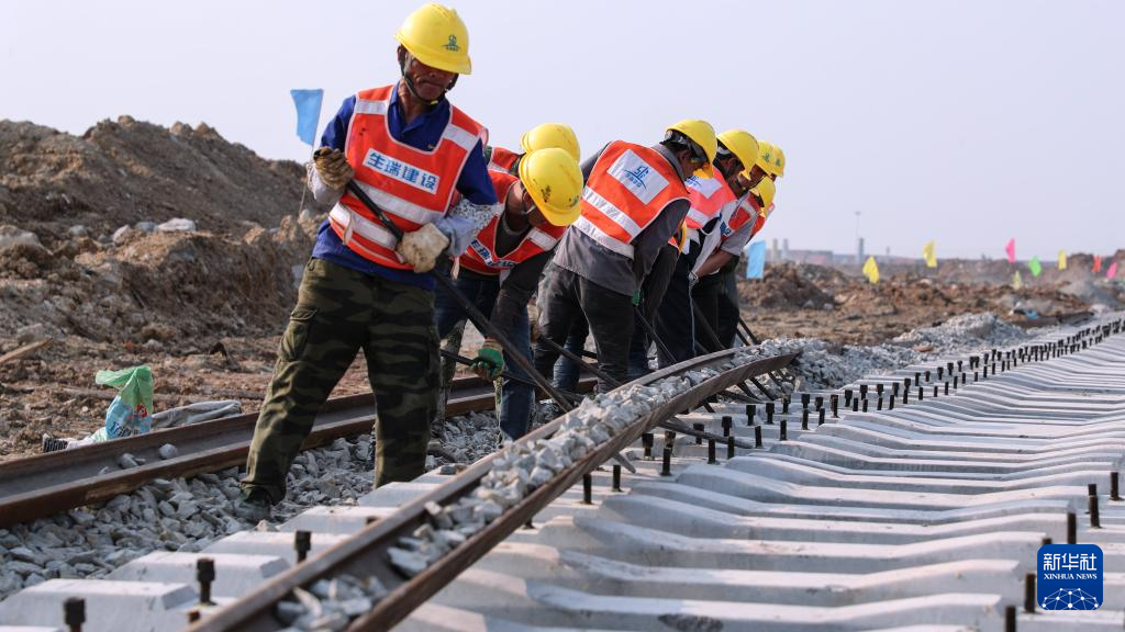 这是铁路工人在钦州港东站扩建工程工地铺设钢轨(2019年3月11日摄)。