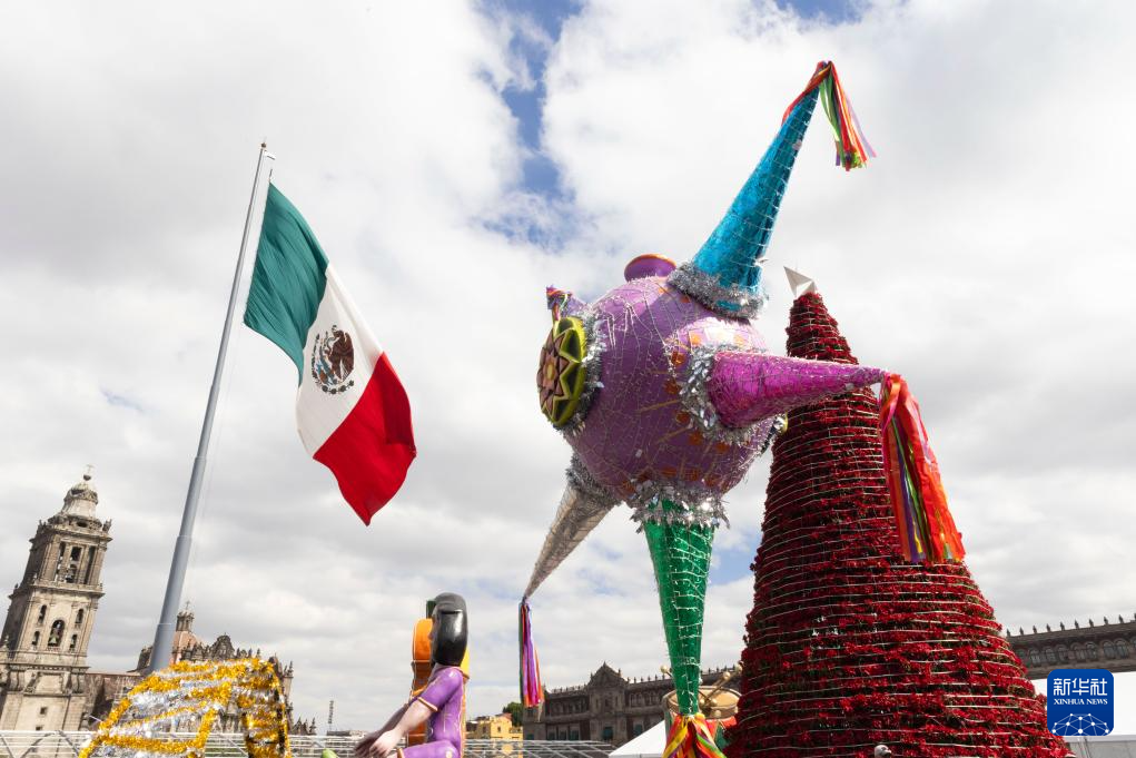 这是12月30日在墨西哥首都墨西哥城宪法广场拍摄的节日装饰。