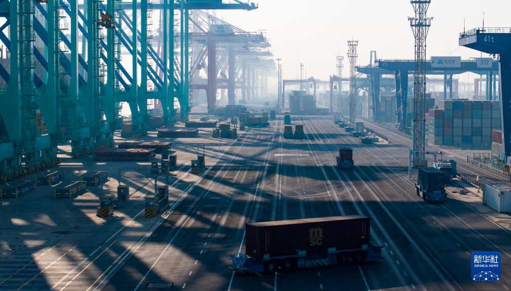 1月3日,智能水平运输机器人行驶在天津港第二集装箱码头(无人机照片)。