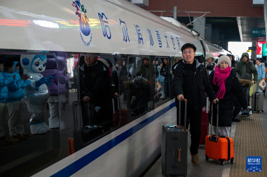 1月4日,在哈尔滨西站,旅客准备乘坐“哈尔滨冰雪大世界”主题高铁列车G1276。