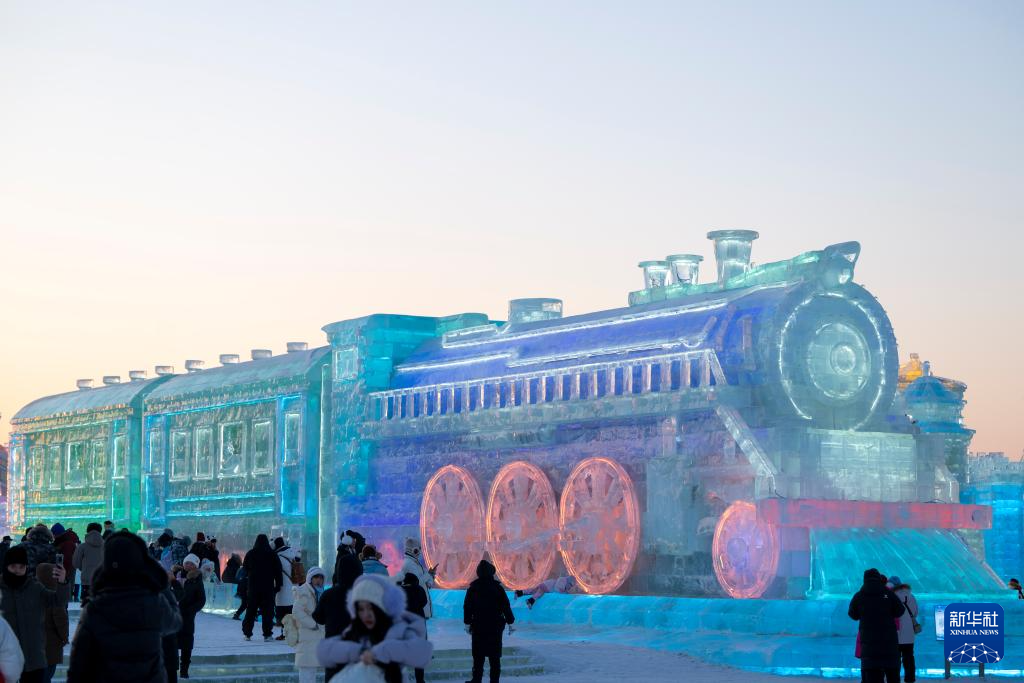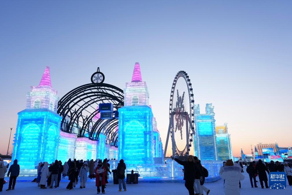1月5日,游客在哈尔滨冰雪大世界园区游玩。