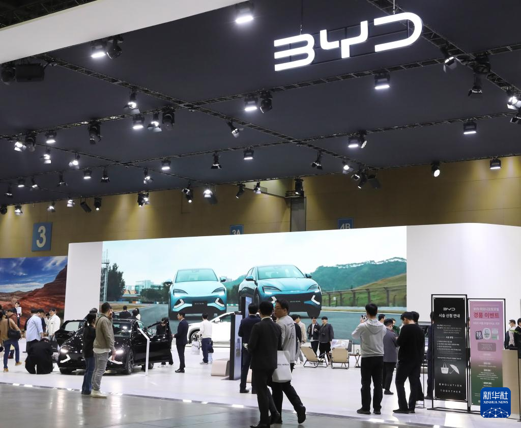 2025年4月8日,在韩国高阳举行的 “2025首尔移动出行展”上,观众参观中国品牌比亚迪展区。