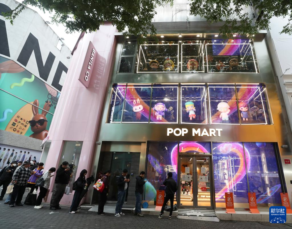 2025年5月20日,消费者在韩国首尔明洞街区的泡泡玛特店面前排队。