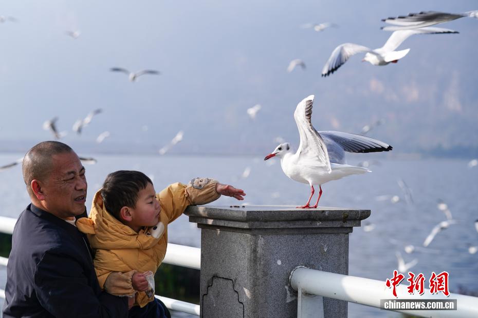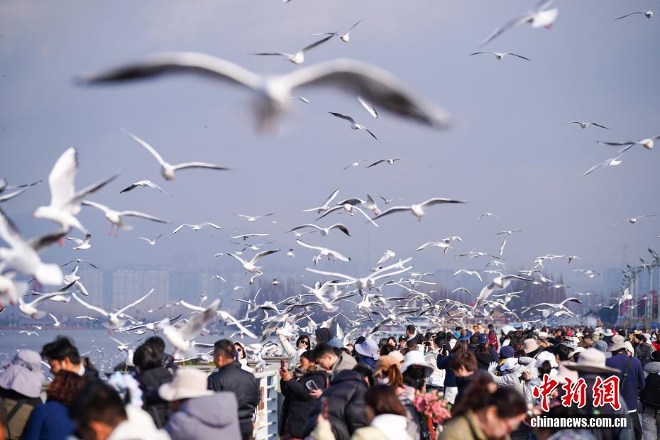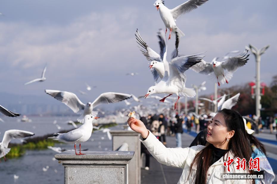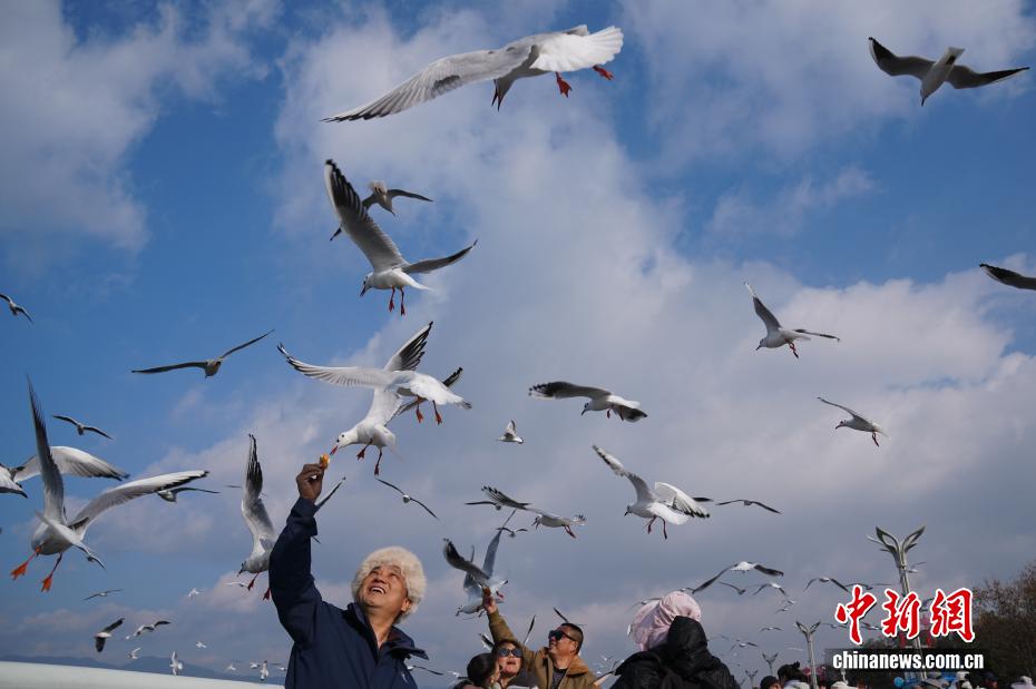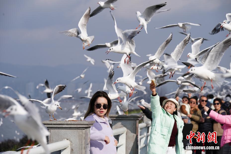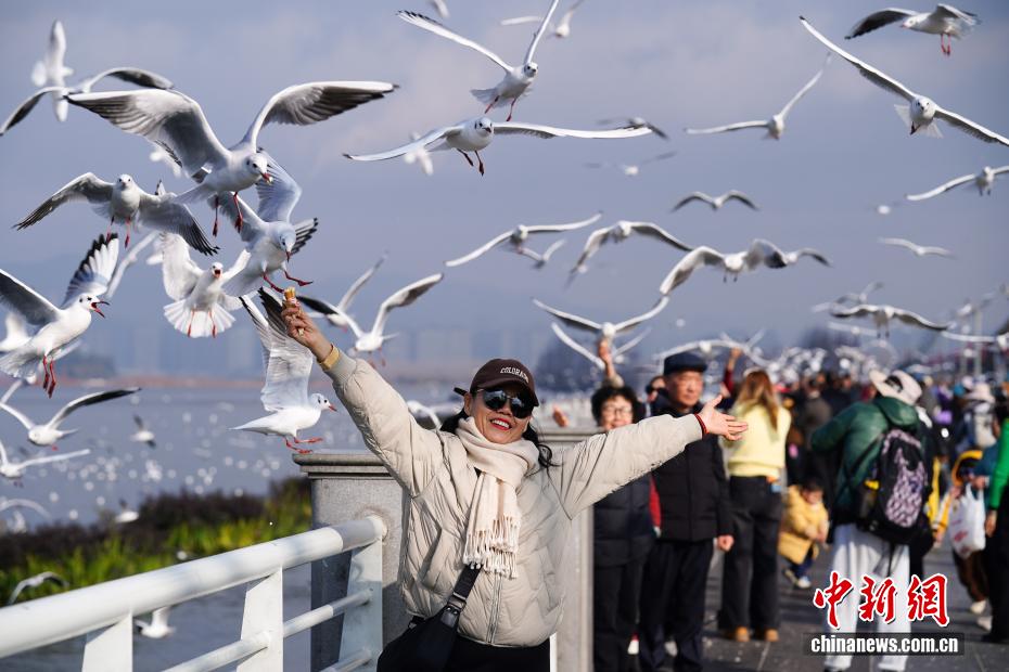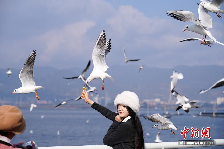 1月9日,昆明天气放晴、气温回升,不少市民和游客来到滇池边观赏美景、投喂红嘴鸥。