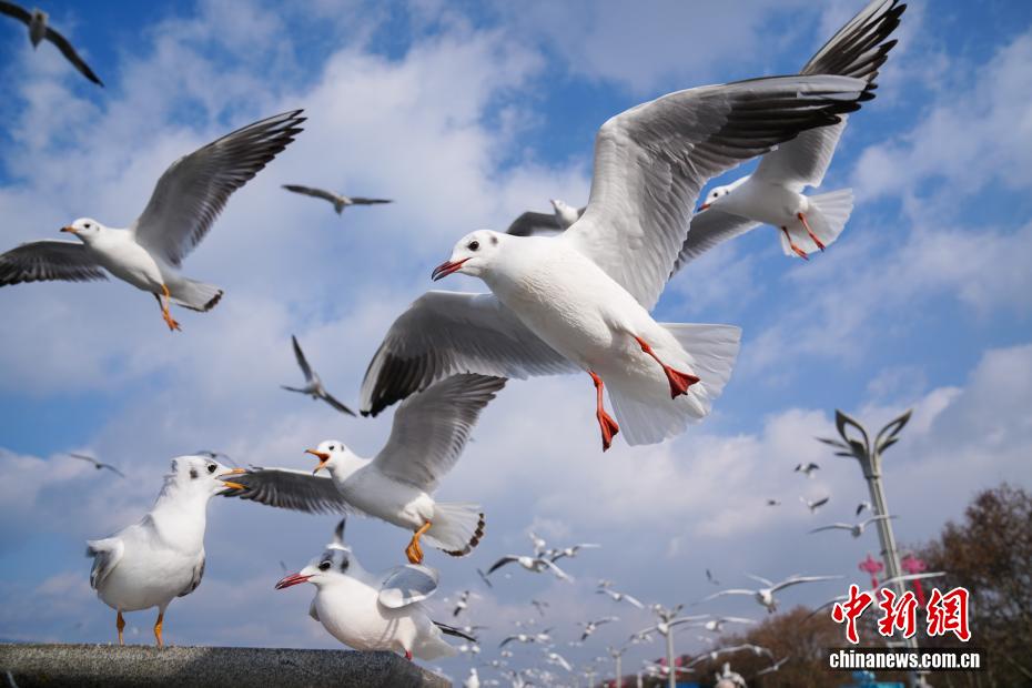1月9日,昆明天气放晴、气温回升,不少市民和游客来到滇池边观赏美景、投喂红嘴鸥。图为滇池边飞舞的红嘴鸥。