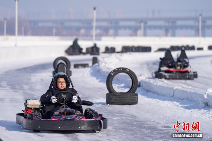 1月11日,黑龙江哈尔滨,小朋友在松花江冰雪嘉年华体验卡丁车。当日,哈尔滨天气晴好,市民游客在第八届哈尔滨松花江冰雪嘉年华上体验各类冰雪项目,乐享冰雪之趣。中新社记者 赵宇航 摄