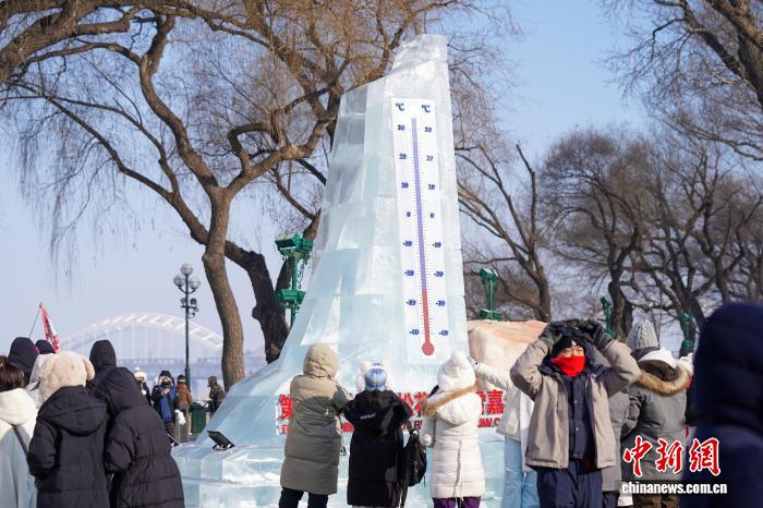 1月11日,黑龙江哈尔滨,冰雕温度计吸引游人。当日,哈尔滨天气晴好,市民游客在第八届哈尔滨松花江冰雪嘉年华上体验各类冰雪项目,乐享冰雪之趣。中新社记者 赵宇航 摄