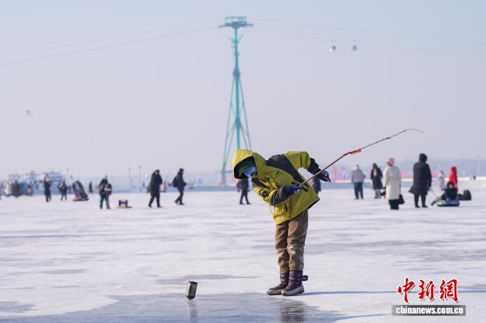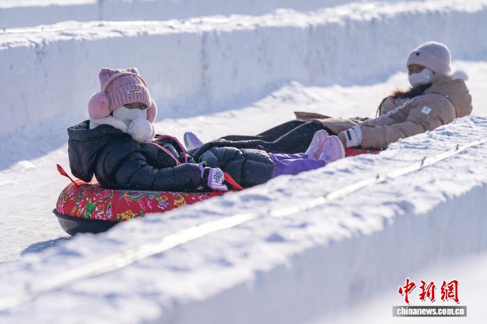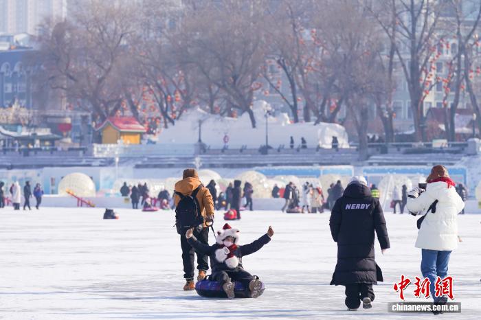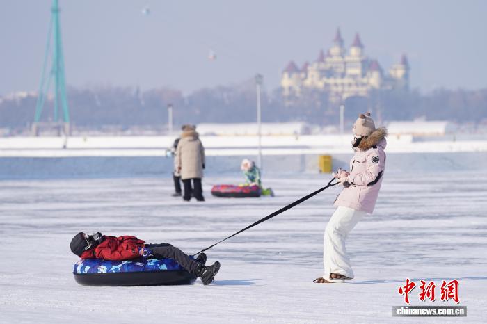 1月11日,黑龙江哈尔滨,游人在松花江冰雪嘉年华游玩。当日,哈尔滨天气晴好,市民游客在第八届哈尔滨松花江冰雪嘉年华上体验各类冰雪项目,乐享冰雪之趣。中新社记者 赵宇航 摄