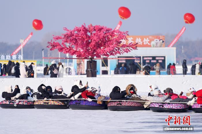 1月11日,黑龙江哈尔滨,游人在松花江冰雪嘉年华玩雪圈。当日,哈尔滨天气晴好,市民游客在第八届哈尔滨松花江冰雪嘉年华上体验各类冰雪项目,乐享冰雪之趣。中新社记者 赵宇航 摄