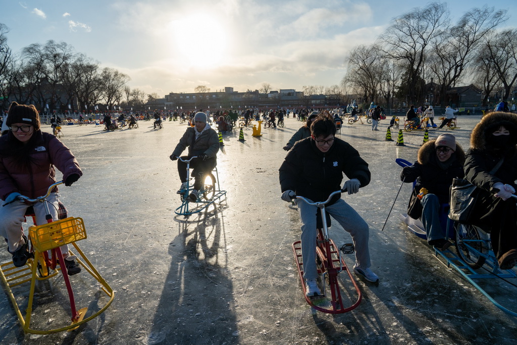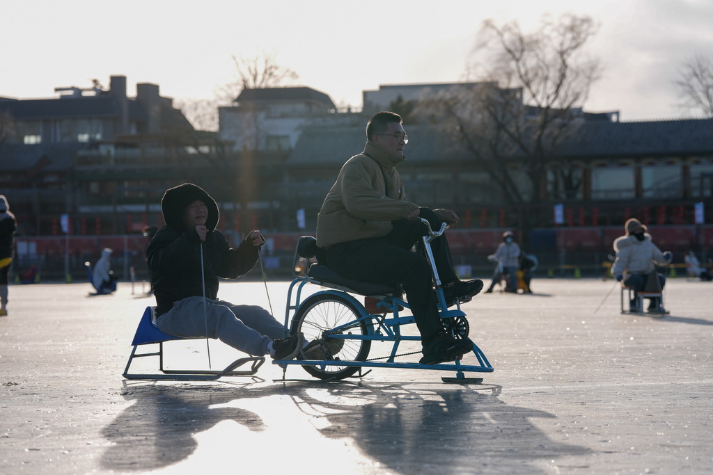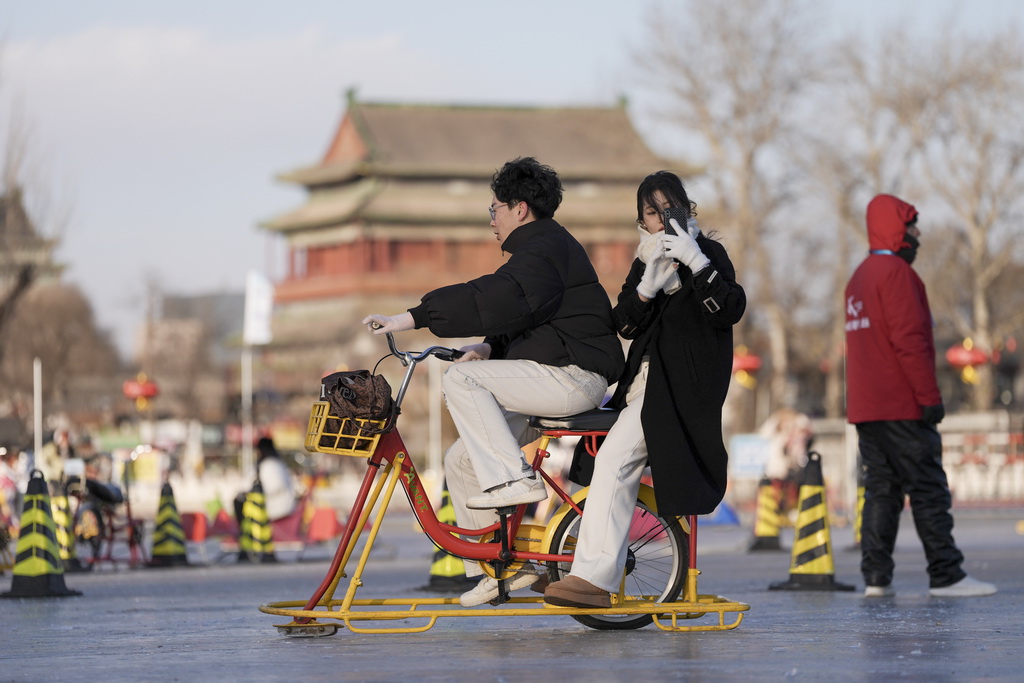 1月10日,北京什刹海前海冰场正式营业,吸引众多游客到此休闲游玩。受气温影响,冰场目前开放的是前海区域。前海冰场运营面积为3.5万平方米,营业时间为8点至21点。新华社记者 谢晗 摄