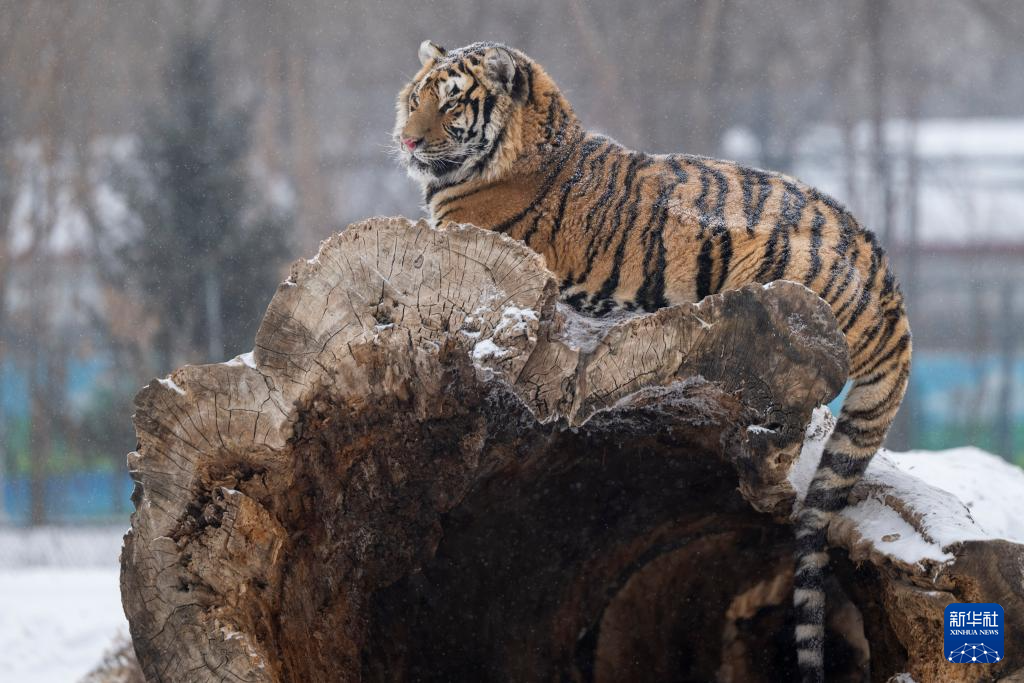 1月12日,冰城哈尔滨市迎来降雪天气,在黑龙江东北虎林园,散放区的东北虎在雪地活动。