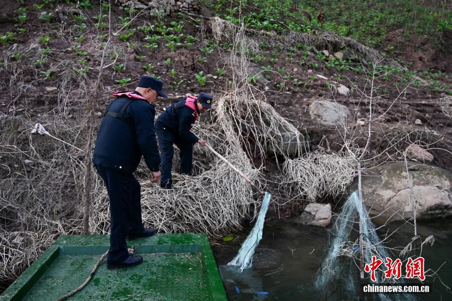 图为万州护渔队队员在岸边打捞废弃渔网。