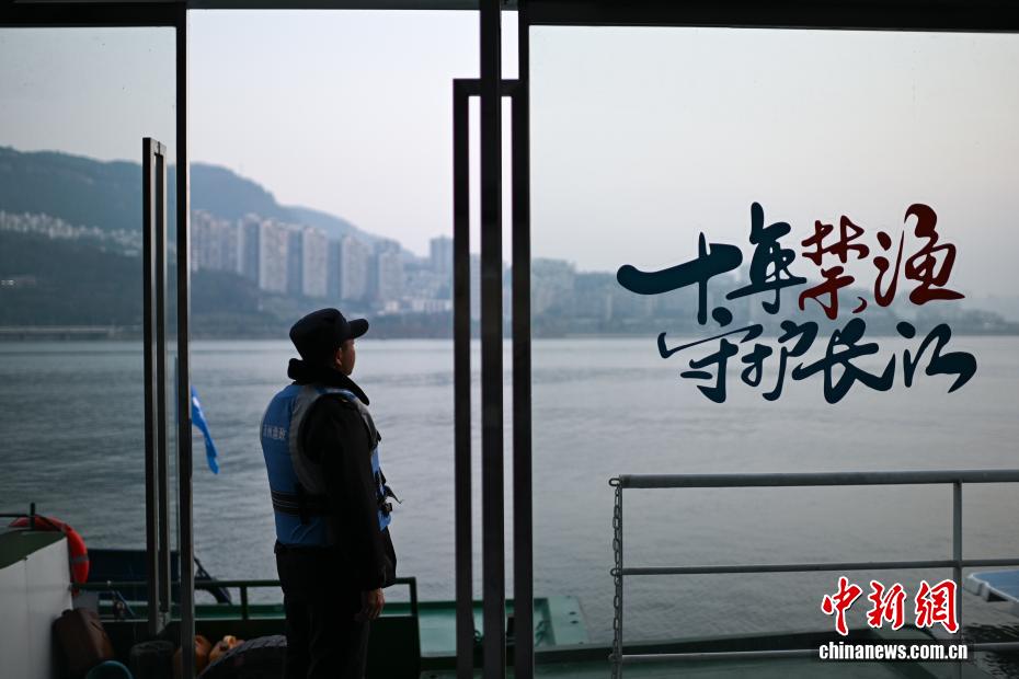 图为一位万州护渔队队员从万州区陈家坝渔政协助巡护工作站眺望长江。