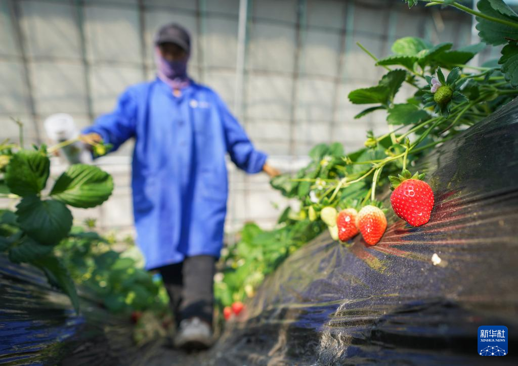 1月12日,在辽宁东港一个草莓大棚内,种植户在采摘草莓。