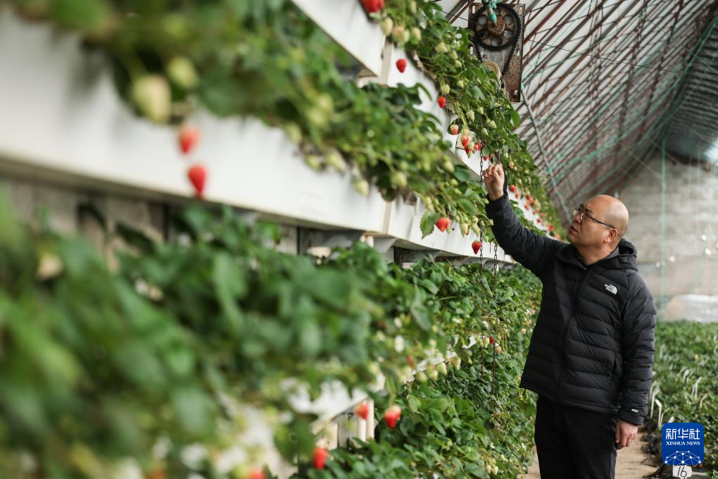 1月12日,在辽宁草莓科学技术研究院,副院长刁玉峰在立体栽培技术展示棚内查看草莓生产苗的生长情况。