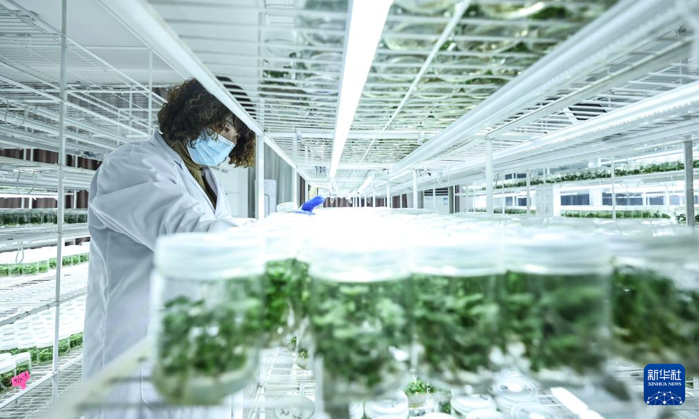 1月12日,在辽宁草莓科学技术研究院,工作人员在进行种苗培育工作。
