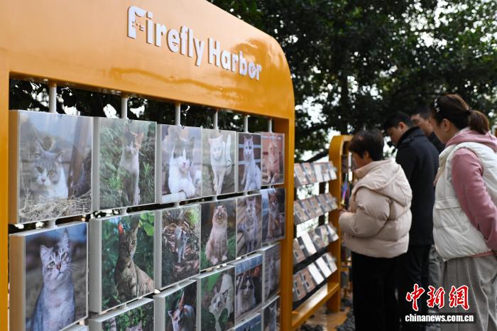1月13日,游客观看重庆萤火虫港湾猫猫主题乐园展示的流浪猫照片与档案。中新社记者 何蓬磊 摄