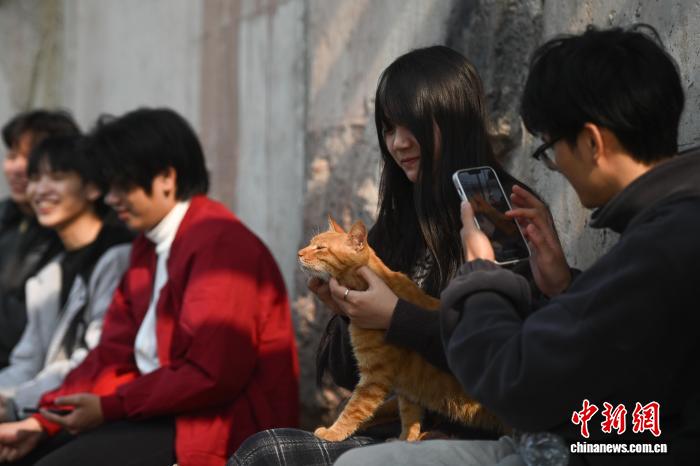 1月13日,游客在重庆萤火虫港湾猫猫主题乐园与猫咪玩耍。中新社记者 何蓬磊 摄