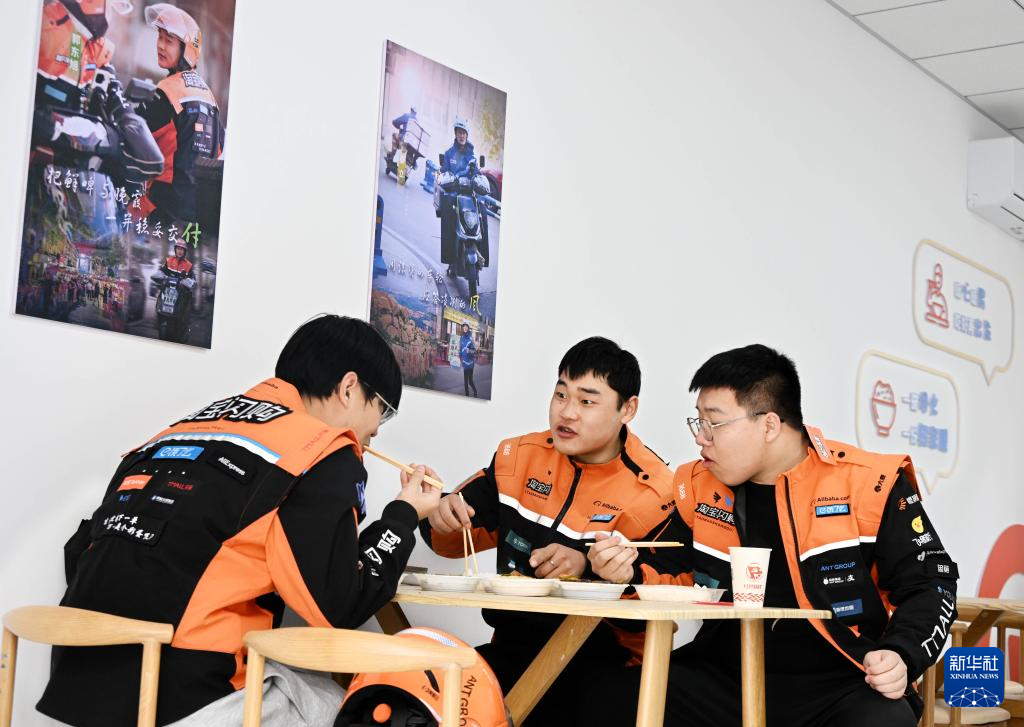 1月14日,在青岛市李沧区“青暖红骑之家”,骑手在共享食堂吃午饭。
