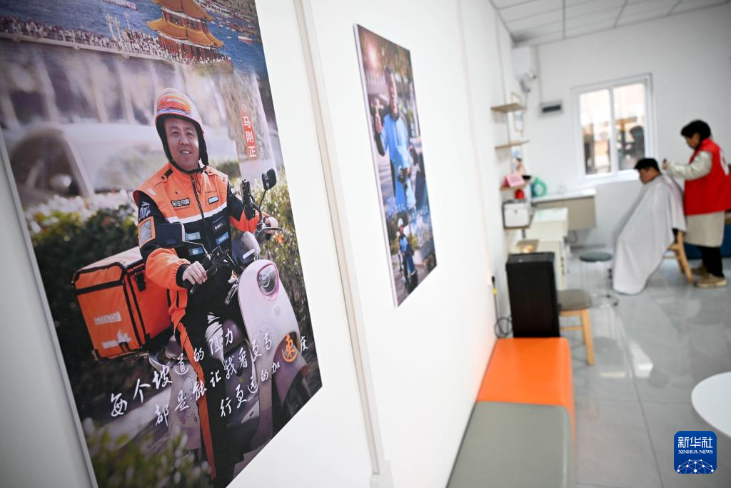 1月14日,在青岛市李沧区“青暖红骑之家”,骑手在理发室理发。