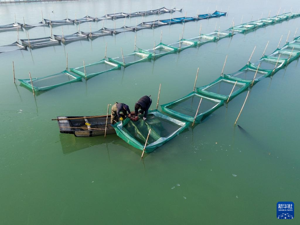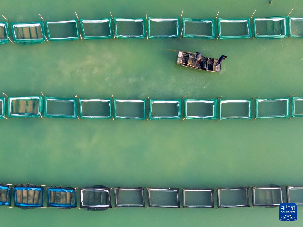 1月15日,东平街道蟹农在蟹池内劳作(无人机照片)。