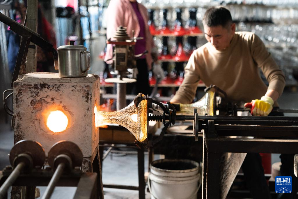 在安徽省天长市石梁镇石峰玻璃有限公司工厂,工人在制作水烟壶(1月14日摄)。